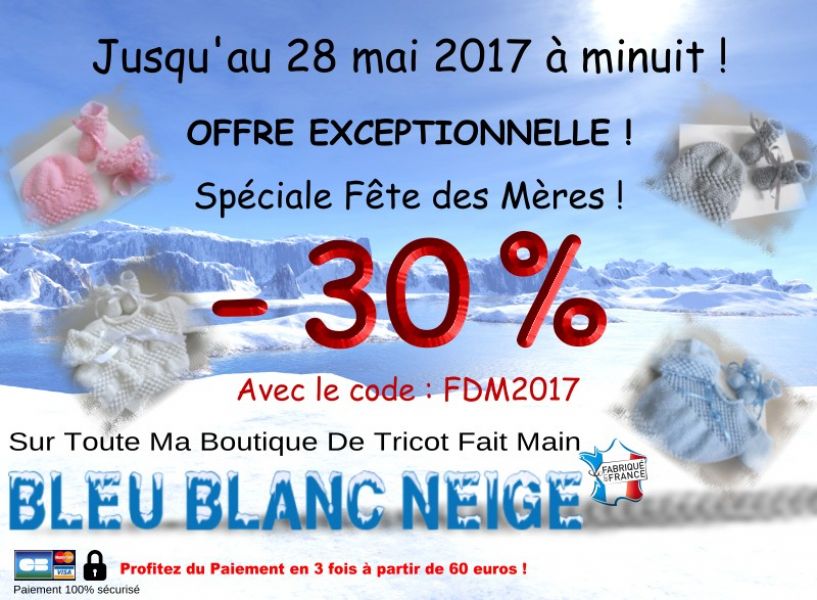 • A l'occasion de la Fête des Mères : -30% sur toute ma boutique BLEU BLANC NEIGE (voir google) jusqu'au 28 mai 2017