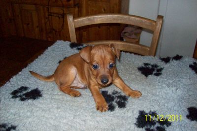- 4 Chiot pinscher nains ont vu le jour le :25/10/2011 de l'union de Enzo Pinscher nains mâle de 3 ans Puce N°250269602581166 et de câline femelle pinscher nain de 4 ans et 1/2 Tatouage N° 2FGF144 il y a 3 mâles et 1 femelle dont 1 mâle noir & feu qui est réserver et 2 mâle marron feu et 1 femelle marron feu ils sont vendu pucés vaccinés vermifugés avec passeport européen et kit chiot Les parents sont visible a l'élevage ou photos sur demande Facilitées de paiement en 2 , 3 , 4 ou 5 fois par chèques