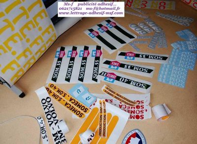 - adhesif lettrage logos Textes & logos sur mesure et pour véhicule & collection tout en adhesif resiste essence g/oil egalement Votre Pub! sur support magnétique pour pouvoir la retirer, le week end ou Pub & Logos pour : * Vitrines * Enseignes * Panneaux ... * Avec pose ou pret a poser en kit * envoi sur toute la france Contactez moi par tel /sans engagement. Ms-f 0621715821 ou par mail/ ms-f@hotmail.fr 77220 Tournan en brie