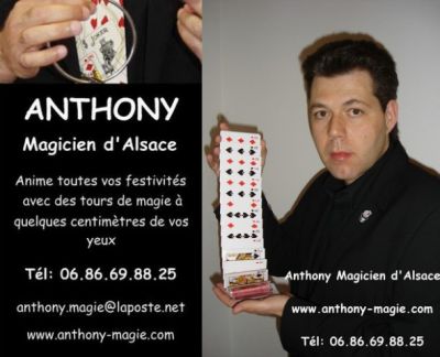 - Bonjour et bienvenue sur mon site , Anthony Magicien d’Alsace La Magie que je vous propose est essentiellement une Magie de proximité également appelé Close-Up Des tours de Magie à quelques centimètres de vos yeux Une touche d’originalité , une pointe d’humour : c’est la formule magique pour une fête réussie! Magie idéale lors des soirées privées , réceptions , mariages , anniversaires , cocktails et autres occasions Possibilité d'un Show scénique d'environ 30 minutes Les enfants ne sont pas oubliés avec un spectacle leur étant particulièrement destiné et la sculpture sur ballons Pour plus d’informations Tél: 06.86.69.88.25 E-mail: anthony.magie@laposte.net