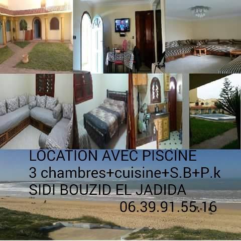 - Location vacance appartement meublé+piscine à la plage de Sidi Bouzid El Jadida Maroc gsm 00212.617.01.66.96 Location vacance appartement meublé 70 m2 au rez-de-chaussée dans une résidence fermée à la plage de Sidi Bouzid El Jadida Maroc pour les familles. Il comprend 2 salons+1 chambre+1 salle de bain+cuisine équipée+terrasse+piscine+parking. le tarif de location est à 500 dhs / nuit (50 euros). Gsm : 06.17.01.66.96 / 06.39.91.55.16 / 06.04.00.15.66 Indicatif pour l’international : Gsm : 00212.617.01.66.96 / 00212.639.91.55.16 / 00212.604.00.15.66