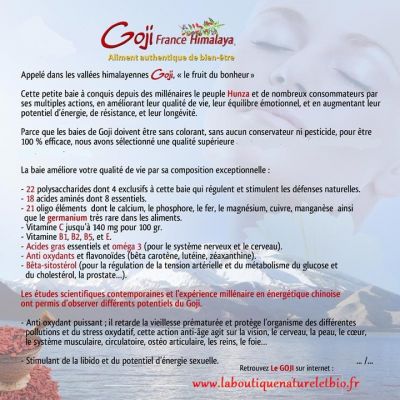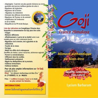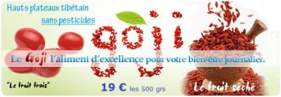 - baies de goji du tibet en sachet de 500 grs Nous vous proposons un goji des hauts plateaux du Tibet, 3200 mètres d'altitude, récoltés sur des pieds d'origine sauvage, quelques photos ici, exempts de tout traitement chimique (confirmation après analyses effectuées auprès du laboratoire Phytocontrole, certifié COFRAC, Nîmes, certificat disponible sur demande). site: http://www.laboutoutiquenatureletbio.fr
