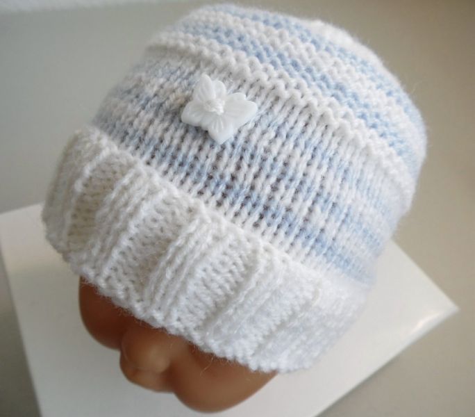 • Bonnet chaussons rayés bleu bébé tricot laine : Tricot laine bébé fait main : duo bonnet et chaussons coloris bleu et blanc, surmonté d'un petit papillon blanc, le tout entièrement fait-main en vente sur ma boutique en ligne Bleu Blanc Neige (tapez Bleublancneige dans google)