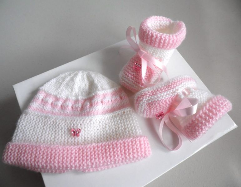 - Bonnet chaussons rayés rose bébé tricot laine : Tricot laine bébé fait main : duo bonnet et chaussons coloris rose et blanc, surmonté d'une perle rose, le tout entièrement fait-main en vente sur ma boutique en ligne Bleu Blanc Neige (tapez Bleublancneige dans google)