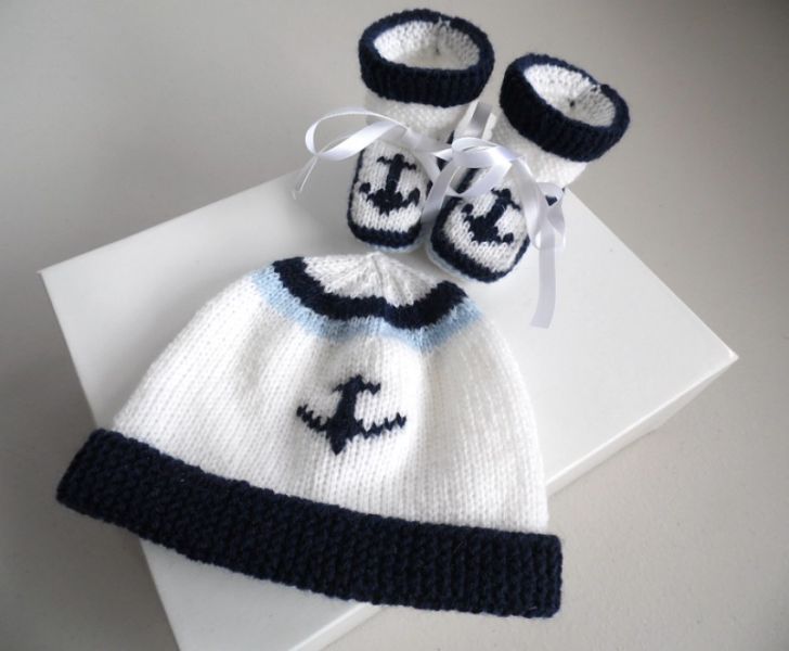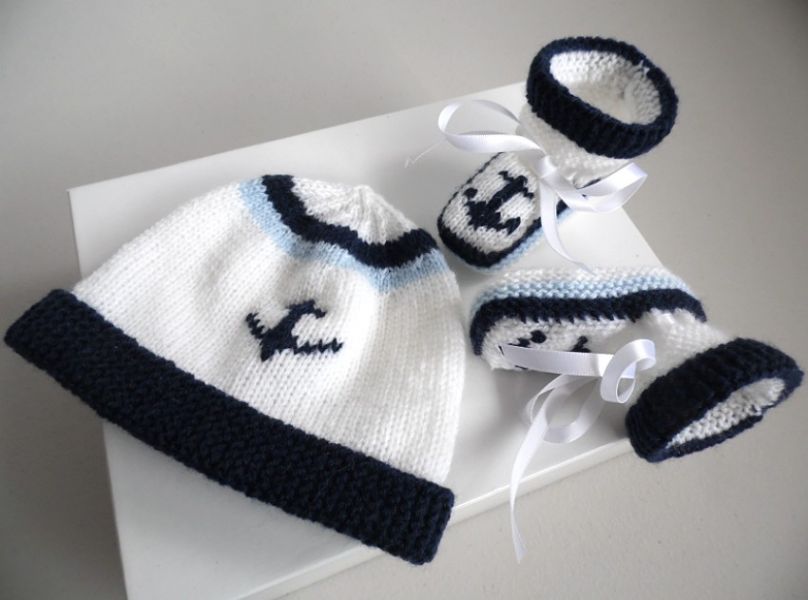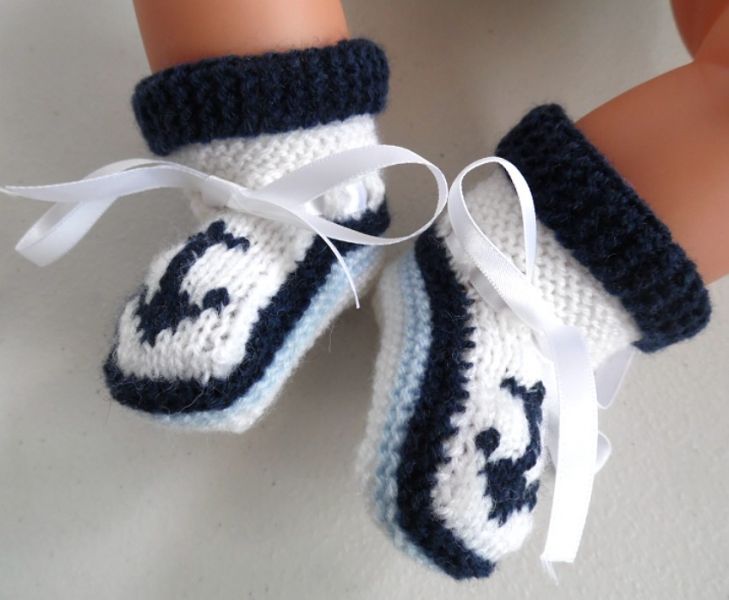 • Vêtement tricot laine bébé fait main : duo bonnet et chaussons coloris bleu marine et blanc, surmonté d'une ancre marine, le tout entièrement fait-main en vente sur ma boutique en ligne Bleu Blanc Neige (tapez Bleublancneige dans google pour arriver sur ma boutique)