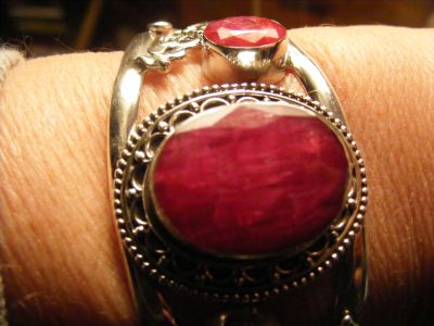 - 65€/ Bracelet hors du commun: demi-jonc en argent titré 925 Enorme rubis central authentique flanqué de 2 plus petits en décalé. 3cm de largeur 30,06g Etat proche du A prendre sur place ou envoi possible +5,60 EUROS de port