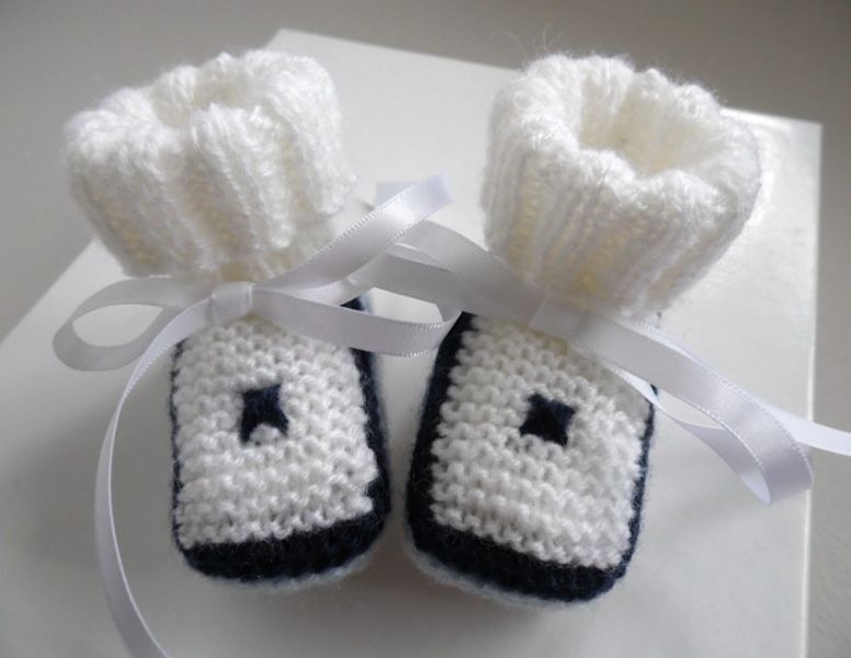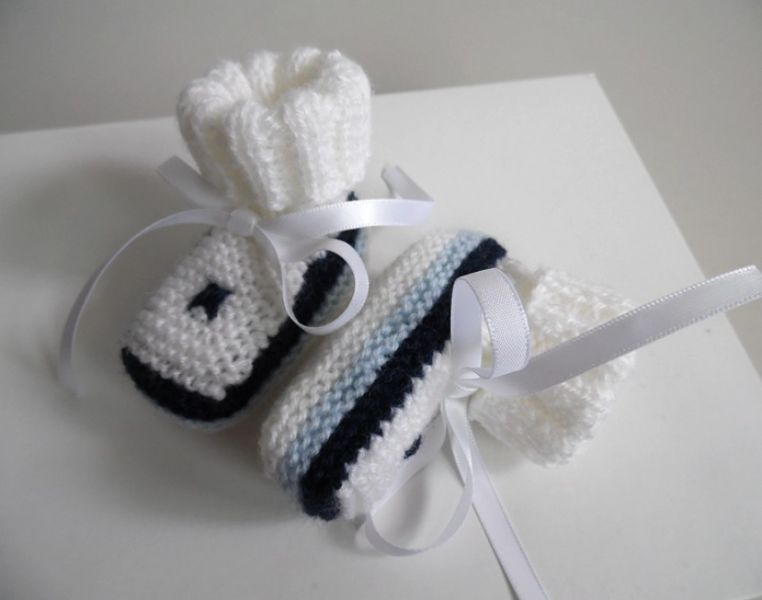 - Vêtement tricot laine bébé fait main : chaussons coloris bleu marine, bleu ciel et blanc, fermé par un ruban satiné blanc, avec un revers côtes 2/2, le tout entièrement fait-main en vente sur ma boutique en ligne Bleu Blanc Neige (tapez Bleublancneige dans google pour arriver sur ma boutique)