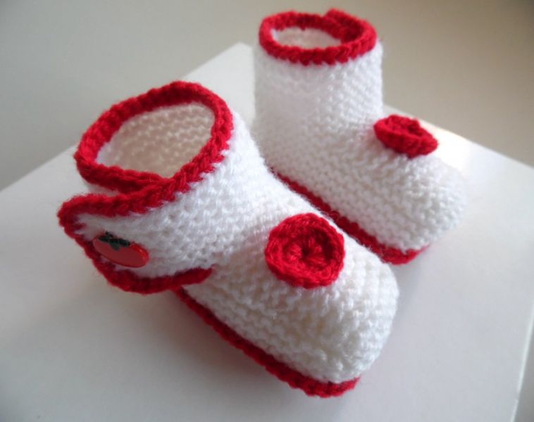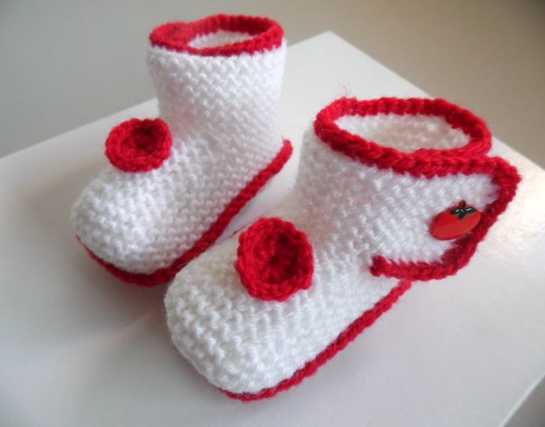 - Chaussons blancs à boutons pomme : Tricot laine bébé fait main : chaussons bébé tricot laine fait main, coloris blanc et rouge, réalisés aux aiguilles au point mousse, fermés par un bouton rouge à motif pomme, que vous pouvez retrouver sur ma boutique en ligne (tapez Bleublancneige dans google)