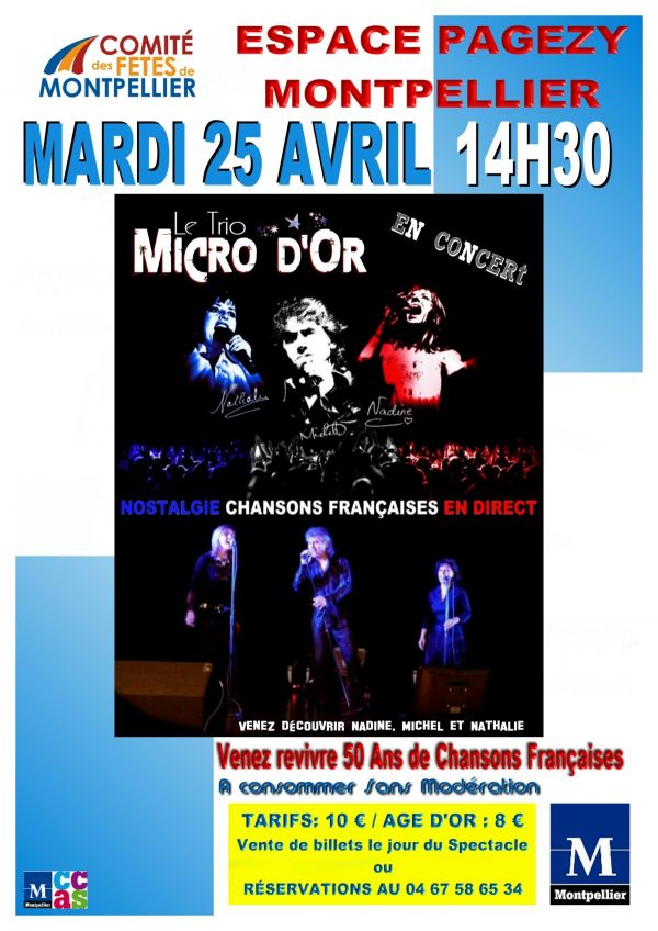 - Le comité des fêtes de Montpellier propose le mardi 25 avril à 14h30 à la salle Pagezy 1 place Francis Ponge à Montpellier un concert avec le trio micro d'or (assis) : venez revivre 50 ans de chansons françaises - Sur réservation au 04 67 58 65 34 - Tarif 10 € et âge d'or 8 €