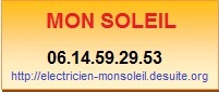 - TRAVAUX D’ÉLECTRICITÉ - INSTALLATION ÉLECTRIQUE - DÉPANNAGE ÉLECTRICITÉ - CONSEIL Installation dans les normes NFC 15-100, certificat de conformité, courant faible, courant fort. En encastré ou en goulotte. 3 Principes : délai respecté - travail soigné - qualité/prix DEVIS GRATUIT RAPIDE ET SANS ENGAGEMENT 06 14 59 29 53 Pour plus d’informations, n’hésitez pas à visiter notre site. http://electricien-monsoleil.desuite.org