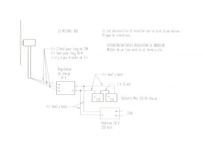 - le mistral 300, 500W max Kits hors réseau Caractéristiques: Corps fondée en alliage d'aluminium, qui est solide et durable. Pendant ce temps il a une bonne dispersion de chaleur. Spécifications: Puissance nominale: 300W Puissance maximale: 500W Diamètre du rotor: 1,5 m Contrôle de charge: Automatique Générateur: aimants permanents Vitesse de démarrage du vent: 2,5 m / s Évalué la vitesse du vent: 12m / s Tension nominale: 24V (sortie éolienne en triphasé) Poids avec emballage : 19 kg Poids net: 16,500 kg Comprise. : Générateur 24V avec pales, et contrôleur de charge, Bride d'accouplement soudable, manuel D’utilisation fr. La garantie de la turbine et du dispositif de contrôle est de 1 an. Batteries, le mât, les câbles non incluses. Vendu séparément: batteries, Onduleur avec sortie 220V, Pour cette Eolienne il faut adopter 2 batteries 12V 150Ah, connectés en série 12V +12V =24V Prix Le Mistral 300W- 500W : 550 Euro ttc. Meca Hi-Tec Rue des Quatre Vents 92 1080 Bruxelles tel / Fax 02 330 53 15 Site: http://www.mecahitec.com