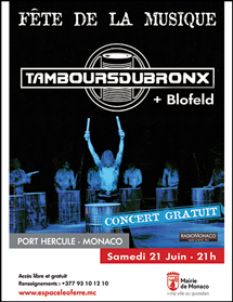 - Les Tambours du Bronx Samedi 21 Juin 2014 à 21h Port Hercule – Monaco Leur première prestation ne devait être qu'un événement unique : depuis 25 ans, l'exception se rejoue chaque soir. Les Tambours du Bronx sont nés en 1987 dans une commune adjacente à Nevers (Nièvre), à Varennes-Vauzelles. Quartier de cheminots et d'ouvriers, ce Bronx local engendre un bloc, une meute au milieu des machines. Plus qu'un groupe, des individualités sans pareil s'affrontent, s'accordent, s'unissent et se confrontent. Les Tambours du Bronx donnent ainsi un sens à l'expression 'art vivant' : l'énergie, le flux, la vie même émane du jeu de cette bande à 17 têtes qui, loin de laisser de marbre, fascine et submerge. Leur nombre, leur élan et leurs influences sculptent une musique énergique et tranchante mêlant rock, indus, techno et afrobeat, modelée de sons synthétiques et de samples. Accès libre et gratuit Renseignements : Mairie de Monaco +377 93 10 12 10