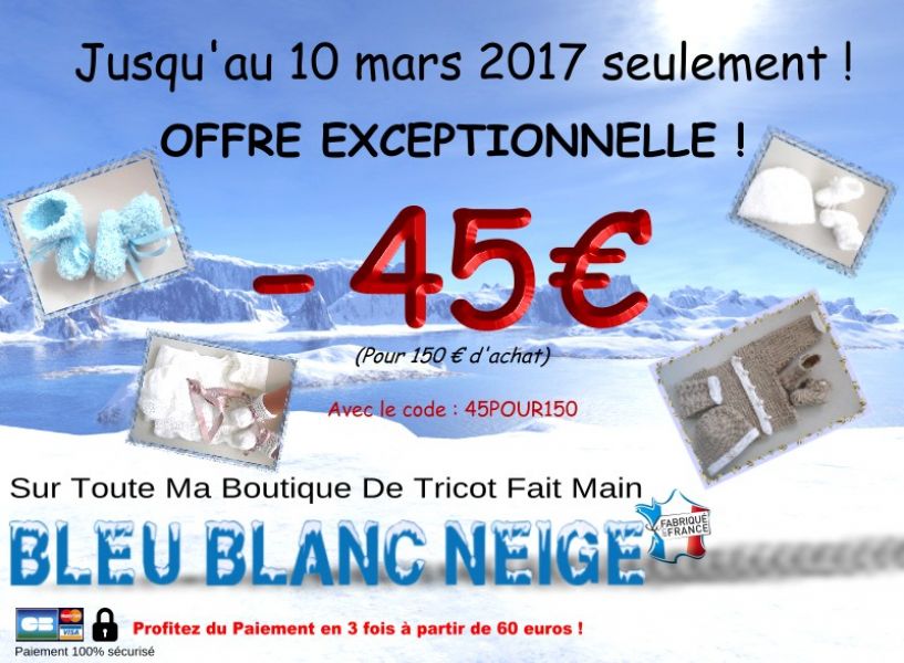 • OFFRE EXCEPTIONNELLE : - 45 € sur toute ma boutique Bleu-Blanc-Neige (voir google) Attention, jusqu'au 10 mars 2017 seulement !