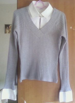 - Pull 2en1 en acrylique, de couleur gris chiné.La partie chemise n'est situé qu'au niveau du col et des manches 100% coton de couleur blanche, en très bon état, taille unique.