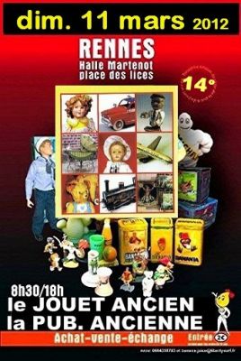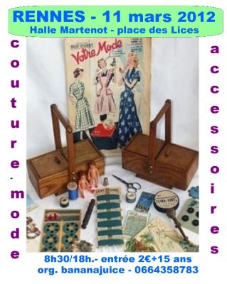 - RENNES – 11 mars 2012 Place des Lices – Halle Martenot : 1ère puces couture – mode rétro & accessoires Tissus, fils, aiguilles, boutons, fermetures, rubans, dentelles, broderie, lingerie, mercerie, laine, perles, bijoux, tricots, habits, sacs, vêtements,chapeaux, linge ancien, napperons, patchwork, patrons, magazines, … manifestation associée : objets pub.-jouets anciens-BD Halle Martenot – 9h/18h.- visiteurs entrée unique 2€ + 15 ans infos 0664358783 - 0666616987