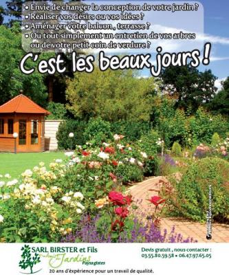 - Nous sommes les 'Amis des Jardins', sarl Birster Père et Fils (Metz), jardiniers-paysagistes. 20 ans d'expérience pour un travail de qualité telle est notre devise ! Nous nous engageons à faire de votre extérieur un endroit unique qui vous ressemble ! Nous assurons: La création : pelouse,massif annuelle ou arbustif La décoration : terrasse bois ou minéral,allées,design L'entretien (ponctuel ou annuel): tonte,binage,élagage,abattage Pour une vie au jardin pleine de sérénité, contactez-nous au : 0355805958 /0647976505 amisdesjardins@gmx.fr Nos devis sont gratuits !