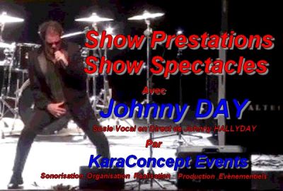 - Show Prestations et Spectacles avec Johnny Day (1er Sosie Vocal en Direct de France de Johnny HALLYDAY) Parrain du Téléthon 2011/2012 pour: -Les Mariages -Les Anniversaires -Les Baptêmes -Les Galas -Les Spectacles -Les Soirées d'entreprises -Les soirées Associatives -Les soirées Privées -Et toutes autres soirées...... Dans: -Les Salles Municipales ou Privées -Les Bars -Les Restaurants -Les Pubs -Les Snaks-Bars -Les Campings -Et tout autres lieux...... Organisations,Réalisations, Sonorisations,Animations Dj Animateurs Dj de Soirées par KaraConcept Events Déclaration à l'URSSAF Vous pouvez nous écrires ou nous téléphoner pour tous renseignements. 06.78.48.71.63/06.82.19.03.01