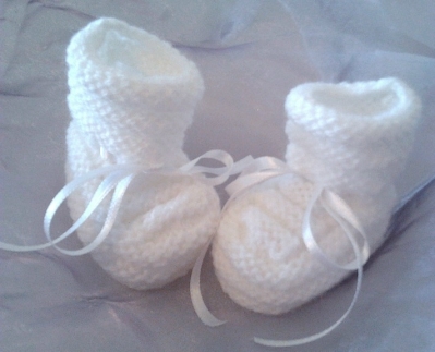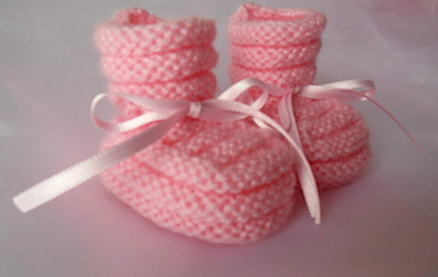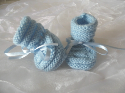 - Tricot bébé - Tricot fait main - Très jolis chaussons réalisés en point fantaisie dessin bourrelets, ce qui leur donne un aspect original, coloris rose, blanc ou bleu - fermés par un joli ruban satiné de la même couleur – entièrement fait main en fil classique très doux – confection artisanale Chaussons taille Naissance (semelle environ 7,5cm)– 100% acrylique - lavage 30° - Prix : 7,95 € - réalisés par Bleublancneige - Rens. Par mail