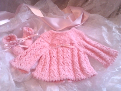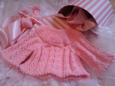 - Joli coffret layette bébé fille ROSE (ou pack cadeau) comprenant une Brassière fermée au dos par 3 pressions transparentes et une paire de Chaussons fermés par un ruban satiné rose que j'ai tricotées 100% fait main. Prêt-à-porter, tricot fait main Bleu blanc neige sur le net réalisé dans un fil classique. A partir de 40 euros, voir sur le site. Taille naissance, coloris rose. 100 % acrylique - Laine spéciale bébé Bergère de France - lavage à 30°. Emballage cadeau soigné avec boite rayée rose/blanc fermée par un joli ruban rose. Possibilité d'envoi postal emballage soigné. Renseignements par mail.