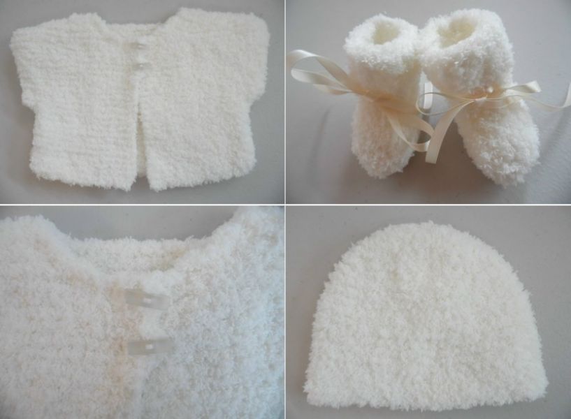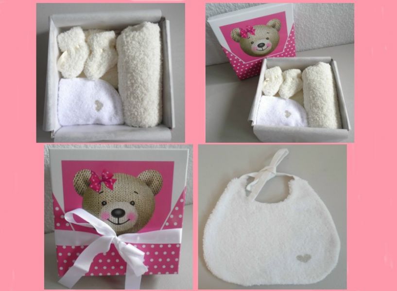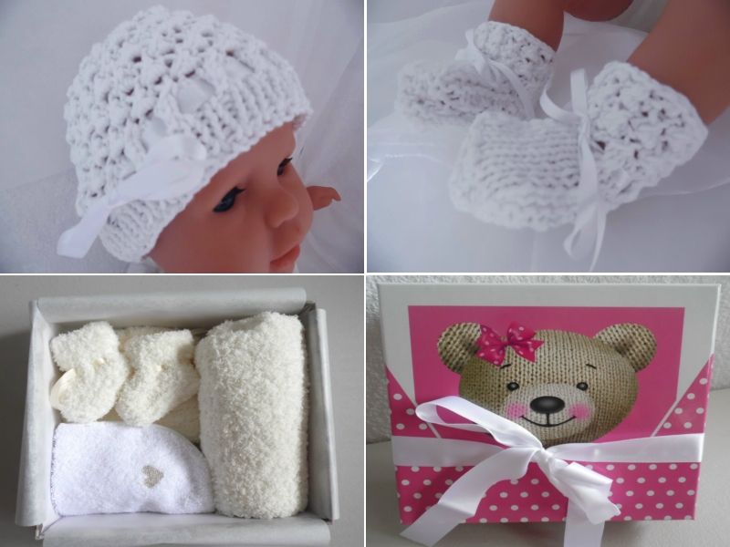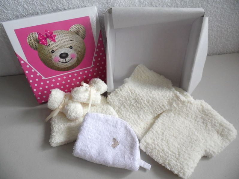 - Tricot bébé – tricot fait main : box bébé cadeau de naissance entièrement fait main, taille naissance/1 mois comprenant : - Un très joli cardigan pour bébé fille, avec son bonnet et ses chaussons en laine Phildouce. Un ensemble bonnet rond et chaussons en laine Sonora. Et un joli bavoir éponge fait main.- Voir détail et prix sur ma boutique creatoutcoeur (voir google).