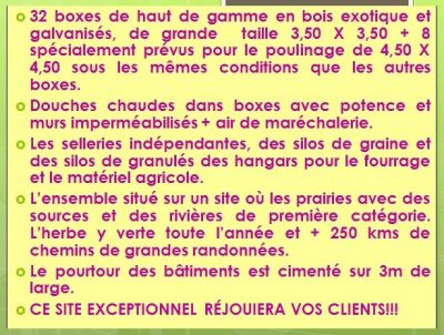 - Unique sur la région Parisienne ce Haras dispose d'une infrastructure hight tech et d'un potentiel de projet pouvant aller du centre équestre à un projet porteur d'emplois, d'habitation de tourisme ou résidentiel. Volontairement je préfère réserver aux amoureux des chevaux la primeur, avant de destiner ce magnifique lieu aux promoteurs, et aux organismes tournés vers le tourisme ou l'habitat. Tous les passionnés du cheval sont invités à se manifester rapidement ce joyaux est aujourd'hui vendu au prix bas de 3 000 000 euros. En effet je suis trop âgée pour m'en occuper toute seule. Contacter moi rapidement les premiers demandeurs seront les premiers servis....