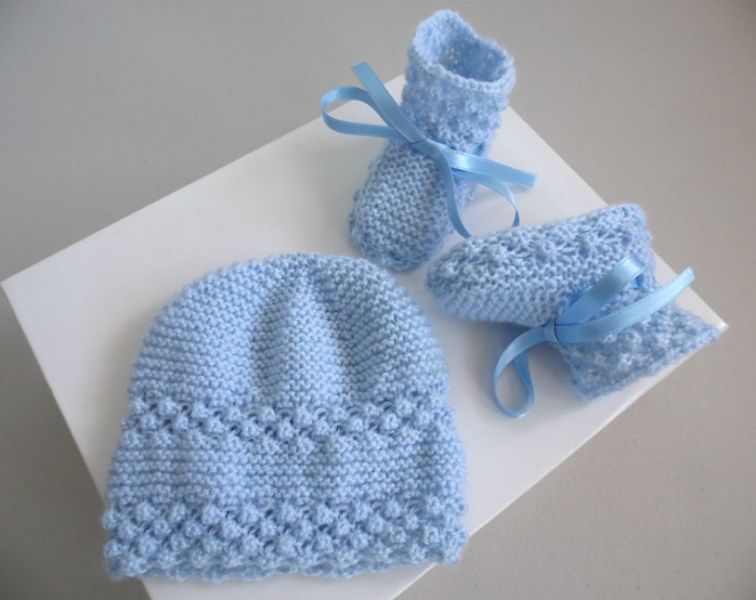 Tricot laine bébé fait main brassière bleue Ma dernière petite brassière... ensemble...